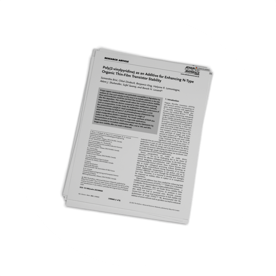 154. Brixi, S.; Dindault, C.; King, B.; Lamontagne, H. R.; Shuhendler, A. J.; Swaraj, S.; Lessard, B. H. Poly(2-vinylpyridine) as an Additive for Enhancing N-Type Organic Thin-Film Transistor Stability doi:10.1002/aelm.202300660