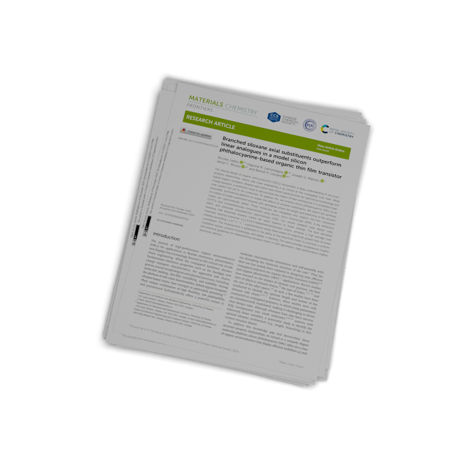 195. Ledos, N.; Lamontagne, H. R.; Manion, J. G.; Brusso, J. L.; Lessard, B. H.* Branched Siloxane Axial Substituents Outperform Linear Analogues in a Model Silicon Phthalocyanine-based Organic Thin Film Transistor. doi:10.1039/D5QM00722D