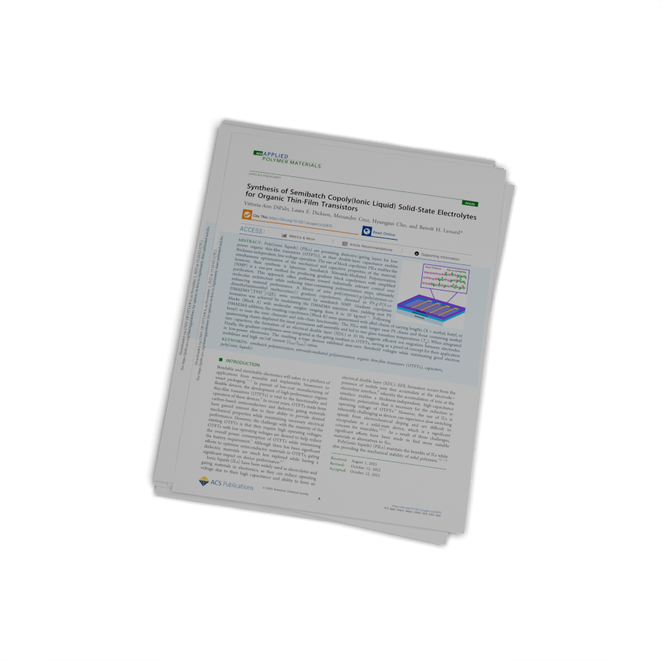 194. Dipalo, V.; Dickson, L. E.; Cruz, M.; Cho, H.; Lessard, B. H.* Synthesis of Semibatch Copoly(Ionic Liquid) Solid-State Electrolytes for Organic Thin-Film Transistors. doi:10.1021/acsapm.5c02870