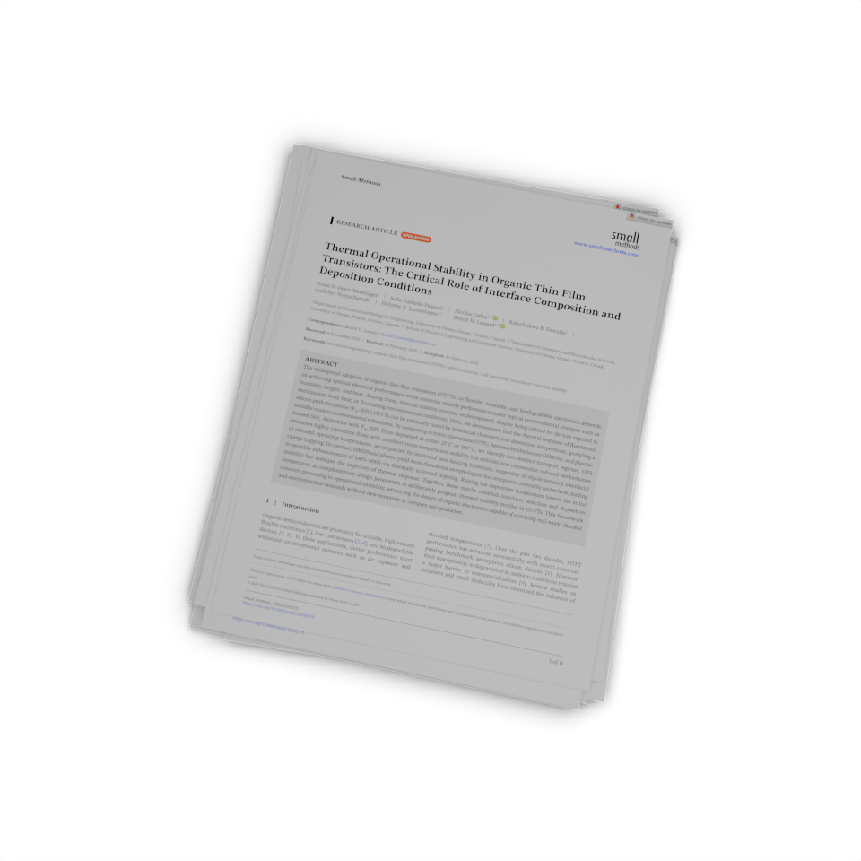 199. Weintrager, F. S.; Gallardo-Pascual, S.; Ledos, N.; Ewenike, R. B.; Nyayachavadi, A.; Lamontagne, H. R.; Lessard, B. H.* Thermal Operational Stability in Organic Thin Film Transistors: The Critical Role of Interface Composition and Deposition Conditions. doi:10.1002/smtd.202502171